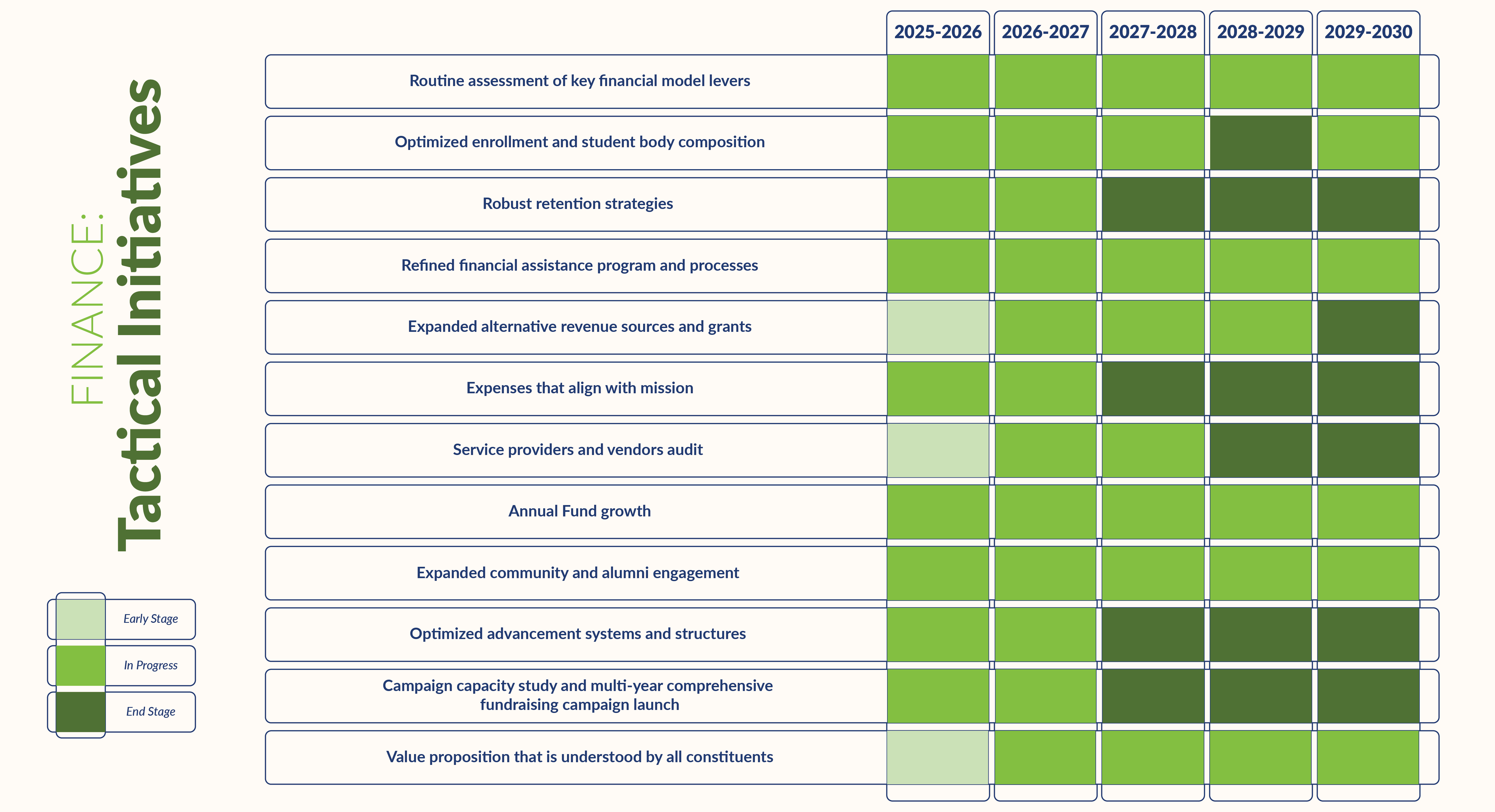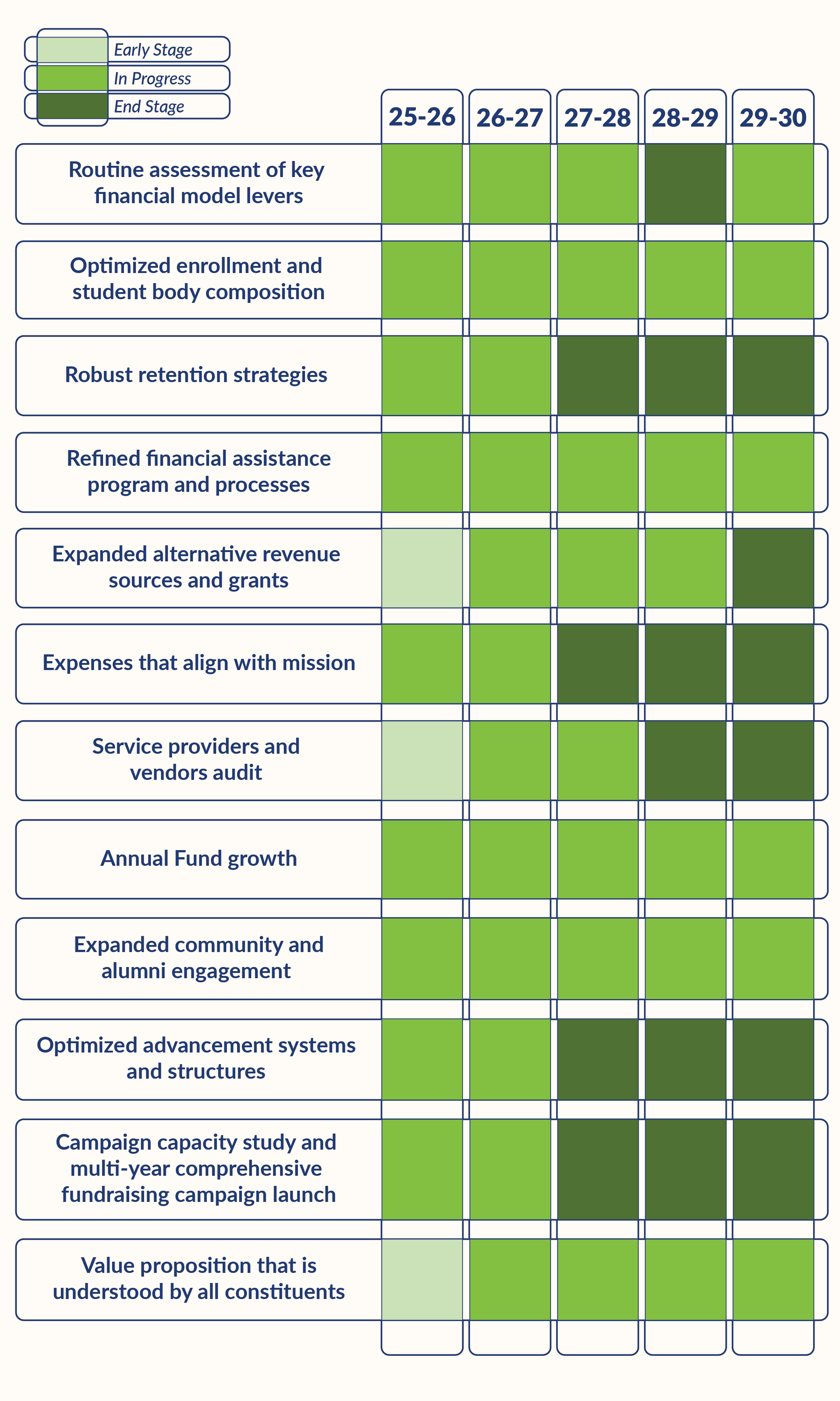 The CFOO instituted regular assessments of the key financial levers with the Finance Committee during the budgeting cycle. (Routine assessment of key financial model levers)