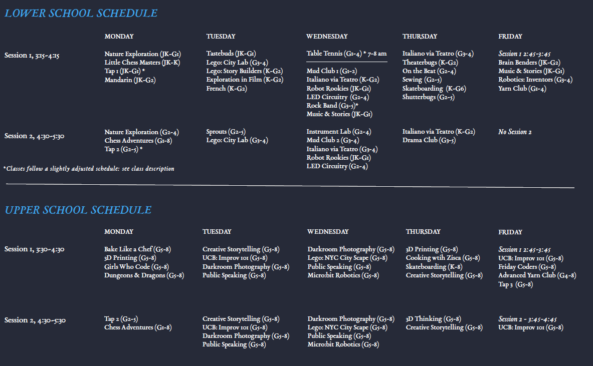 ASP Winter offers an additional 9 new classes for the Grade 5-8 students, including Improv, Darkroom Photography, Storytelling, Public Speaking, and Robotics. (Restructured extracurricular and auxiliary programming)