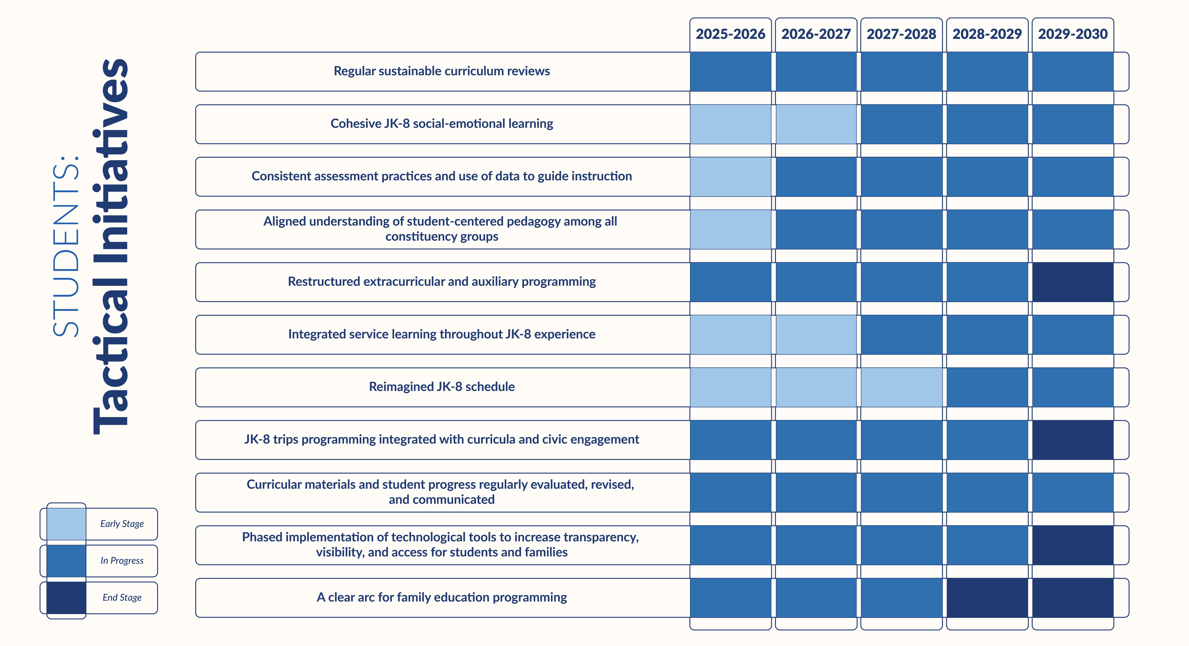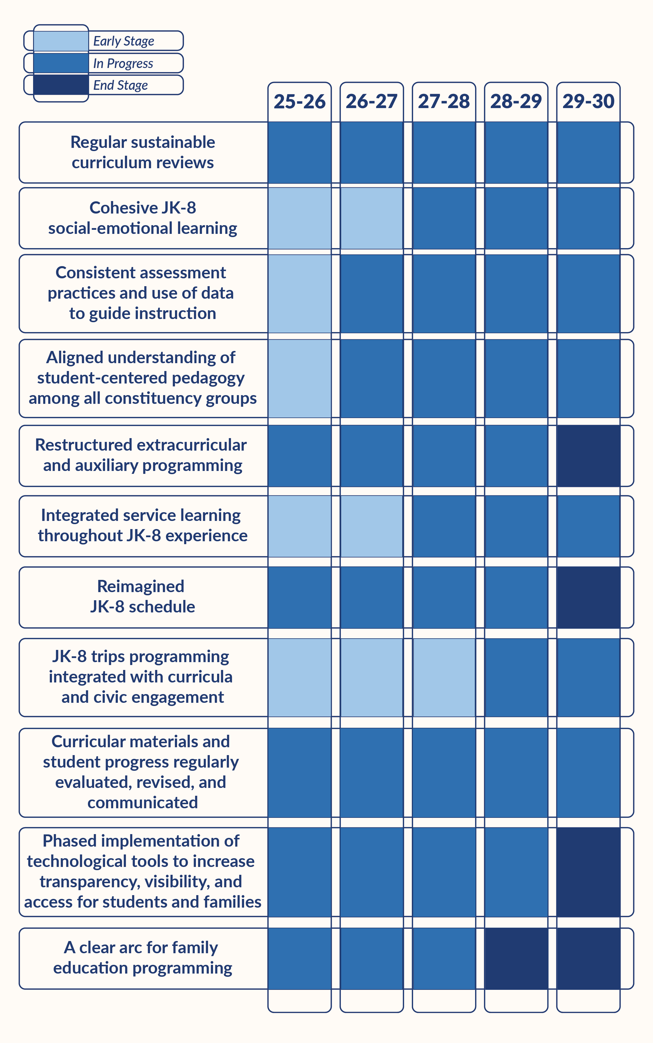 The review of the extracurricular and afterschool programs will be completed, resulting in a robust suite of experiences that meet the diverse needs of our students. Our JK-8 trip programming will also be fully integrated with the curriculum and explicitly tied to our institutional commitment to civic engagement. Concurrently, the comprehensive integration of service learning throughout the JK-8 experience will be well underway. Throughout this period, we will continue to regularly evaluate, revise, and communicate curricular materials and student progress, ensuring that our technological tools consistently support transparency, visibility, and access to the curriculum for both students and families.